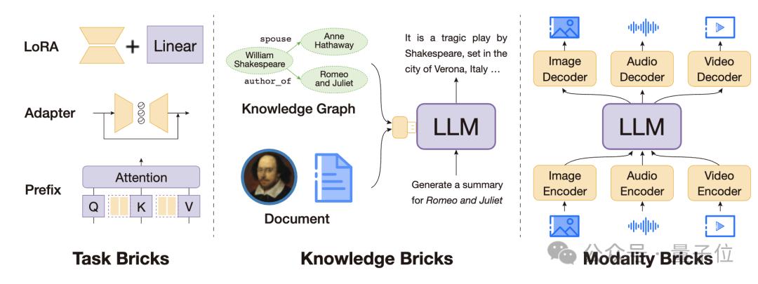 其中,最广为人知的是通过少参数微调形成的任务模块,保持模型主体参数不变,仅微调少量的任务相关参数。进一步地,许多研究发现,小规模的外部插件,不仅可以赋予大模型任务特定的能力,还可以为它们补充更多额外的知识和功能,例如用于世界知识注入的知识插件、用于多模态组合的模态插件、用于长文本处理的记忆插件,以及用于推理加速的压缩插件等。