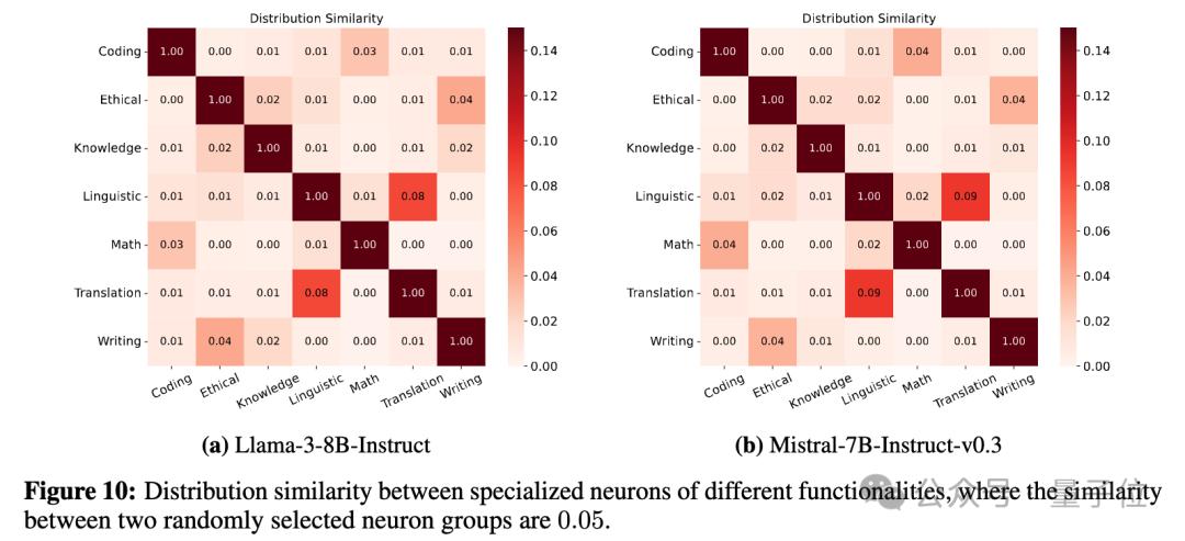 此外,Llama-3-8B-Instruct中的知识相关神经元、Mistral-7B-Instruct-v0.3中翻译相关神经元对每一种能力都非常关键,这可能是常驻神经元的影响,识别特定能力神经元时算法,将常驻神经元识别出来,影响了模型通用能力。这也进一步需要研究者针对神经元能力探索开展更多的后续研究。