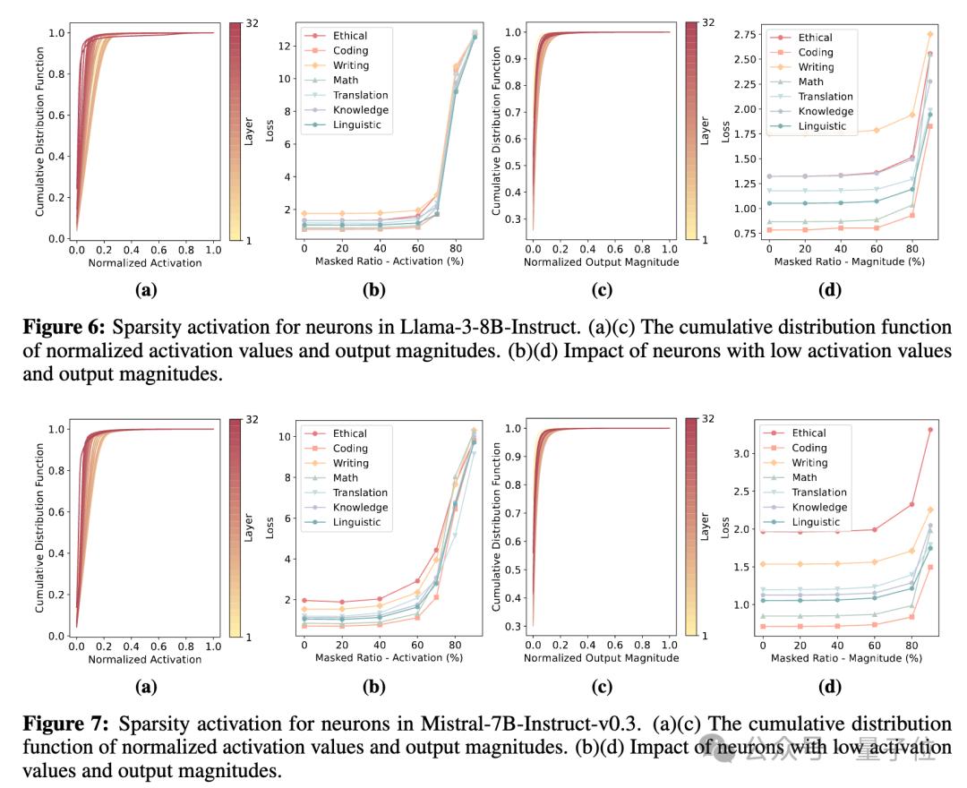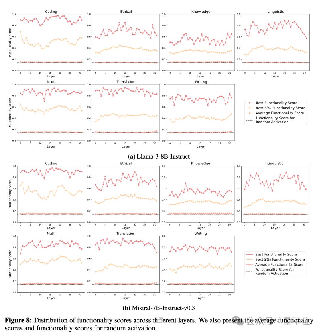 (2)针对功能分化特性:作者选取了7种大模型能力,包括代码、伦理、知识、语言、数学、翻译和写作能力,并且计算了神经元激活与输入指令所需能力之间的相关性。下图结果表明,每种能力都有非常少量的神经元与其高度相关,而在需要改能力的指令中,大部分与该能力无关的神经元的激活特性与随机激活的神经元相似。