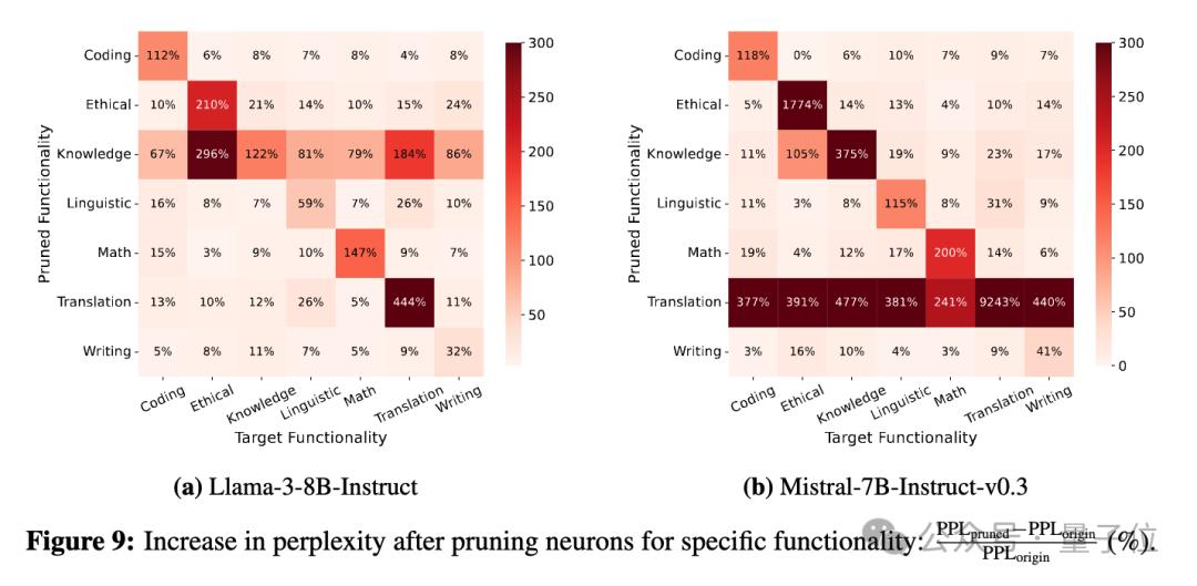 比如,对于Llama-3-8B-Instruct而言,剪除代码神经元之后,性能下降(PPL上涨了) 112%,而对其他能力的性能影响均不超过8%。