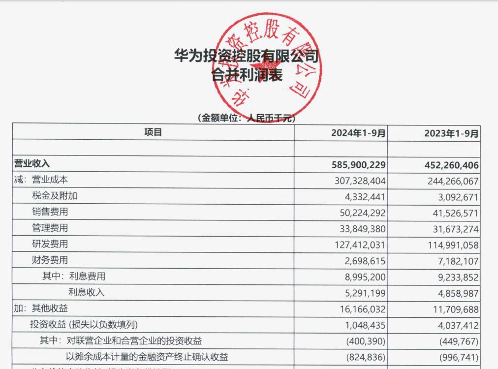 10月31日,华为投资控股有限公司(简称“华为”)公布2024年前三季度财报。前三季度,华为实现营收5859亿元,较去年的4522.6亿元增长29.55%;归母净利润为628.68亿元,较去年的728.86亿元下降了13.75%。