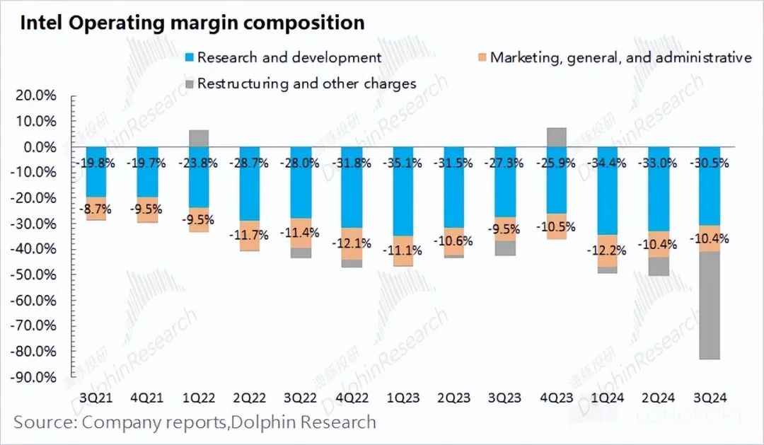 1.3 经营费用端:英特尔在 2024 年第三季度经营费用为 110.54 亿美元,同比增长 83.4%。经营费用的大幅增加,主要是重组费用及商誉减值等相关支出大幅提升影响。