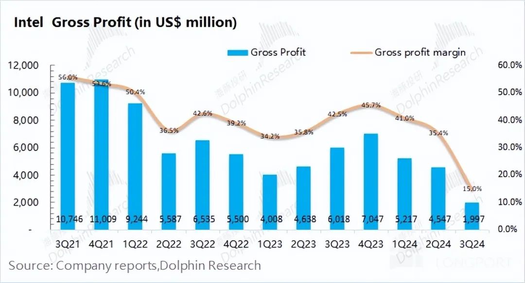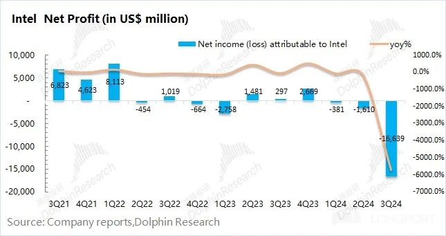 1.4 净利润端:英特尔在 2024 年第三季度净利润为-166.4 亿美元,季度出现巨额亏损