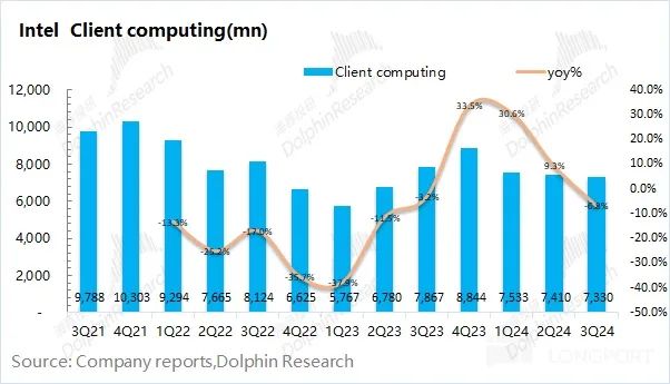 英特尔的客户端收入在 2024 年第三季度实现 73.3 亿美元,同比下滑 6.8%,略低于市场预期(74.6 亿美元),这也是公司本季度收入下滑的主因。具体来看,本季度 Desktop 业务下滑 24.8%,而 Notebook 业务却有 8.5% 的增长。