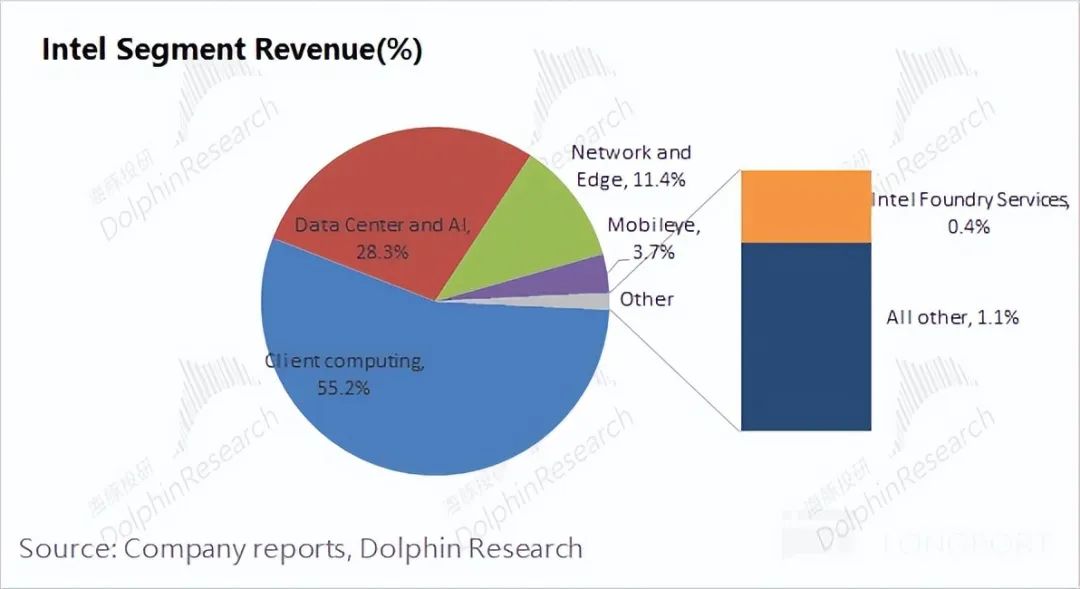英特尔的业务由客户端业务、数据中心及 AI、网络及边缘域、Mobileye 和晶圆代工服务等部分组成。其中客户端业务和数据中心及 AI 业务是公司最大的收入来源,两者合计占比达到 80% 以上。