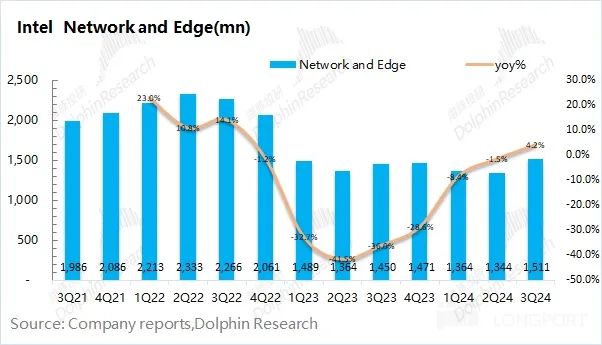 英特尔的网络及边缘域收入在 2024 年第三季度实现 15.11 亿美元,同比增长 4.2%,收入占比仅为 1 成。经历此前客户端库存调整,公司的网络及边缘域业务迎来从底部的回暖,公司将该业务的重点转向网络和电信方面。