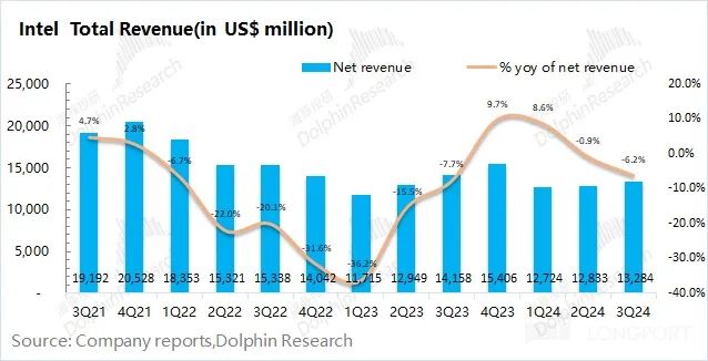1.1 收入端:英特尔在 2024 年第三季度实现营收 132.84 亿美元,同比减少 6.2%,略好于市场预期(130.25 亿美元)。季度收入同比减少,主要受客户端业务和数据中心及 AI 业务下滑的影响。