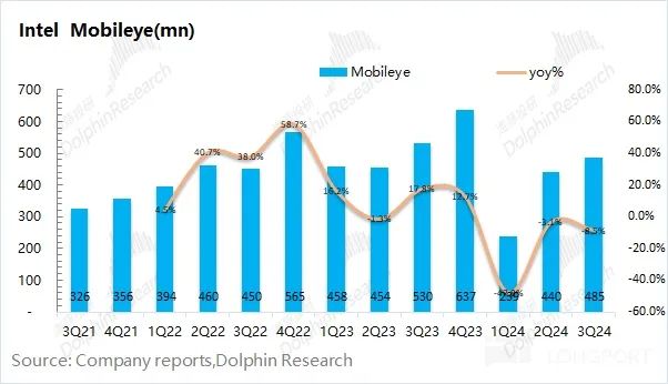 1)英特尔的 Mobileye 收入在 2024 年第三季度实现 4.85 亿美元,同比下滑 8.5%,收入占比不到 5%。本季度的下滑,虽然是受公司对中国的出货量减少 50% 以上的影响,但公司依旧维持全年收入指引。