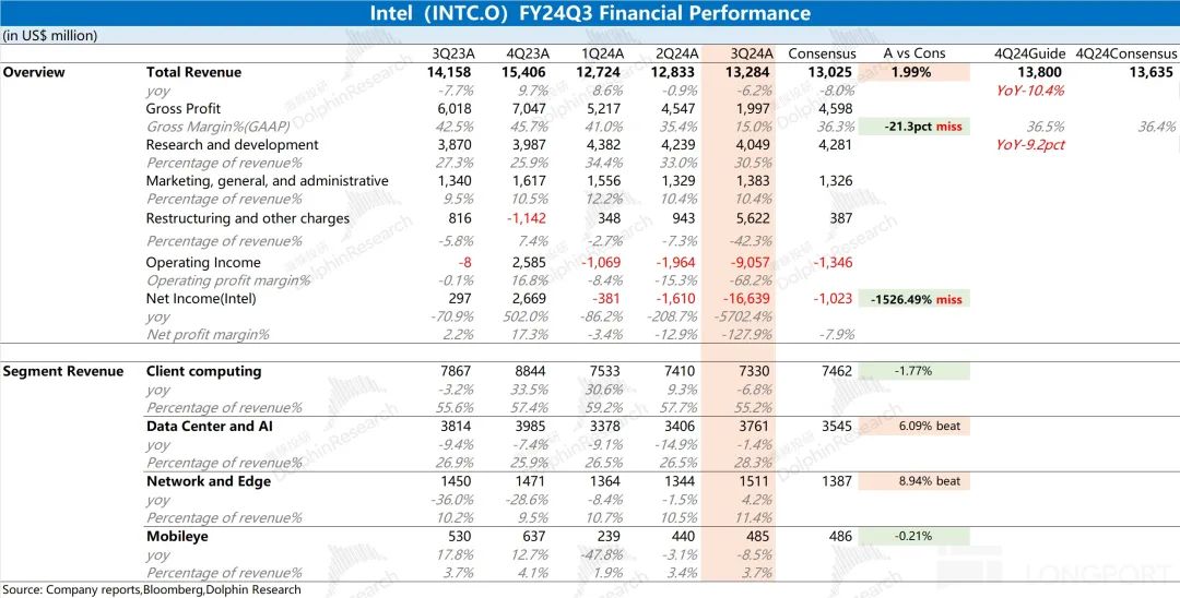 1、核心数据:再次陷入亏损。英特尔在 2024 年第三季度实现营收 132.8 亿美元,同比下滑 6.2%,略好于市场预期(130.3 亿美元)。季度收入同比减少,主要受客户端业务和数据中心及 AI 业务下滑的影响。英特尔在 2024 年第三季度净利润为-166 亿美元,利润大崩盘,这主要是因为公司在本季度计提了多项一次性费用。剔除相关影响后,公司本季度经营面利润在盈亏平衡线附近;