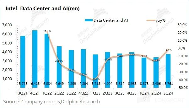 英特尔的数据中心及 AI 收入在 2024 年第三季度实现 37.61 亿美元,同比下滑 1.4%。