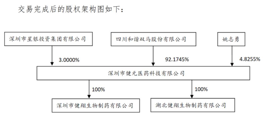 交易完成后,四川双马持有深圳健元92.1745%的股权,星银集团持有深圳健元3%的股权,自然人姚志勇持有深圳健元4.8255%的股权。本次交易实施完毕后,深圳健元成为四川双马合并报表范围内的控股子公司。