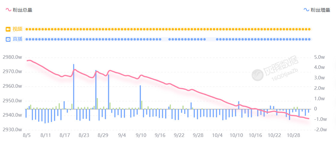 以讨论度最高的居里夫人口误事件为例,事情发生在9月30日,隔天开始发酵。新抖数据显示,9月30日与辉同行账号还浅浅涨了500粉丝,在10月1日-10月3日,日均近仅仅掉粉1000-2000,那也是与辉同行在这三个月内唯三天的掉粉时间。