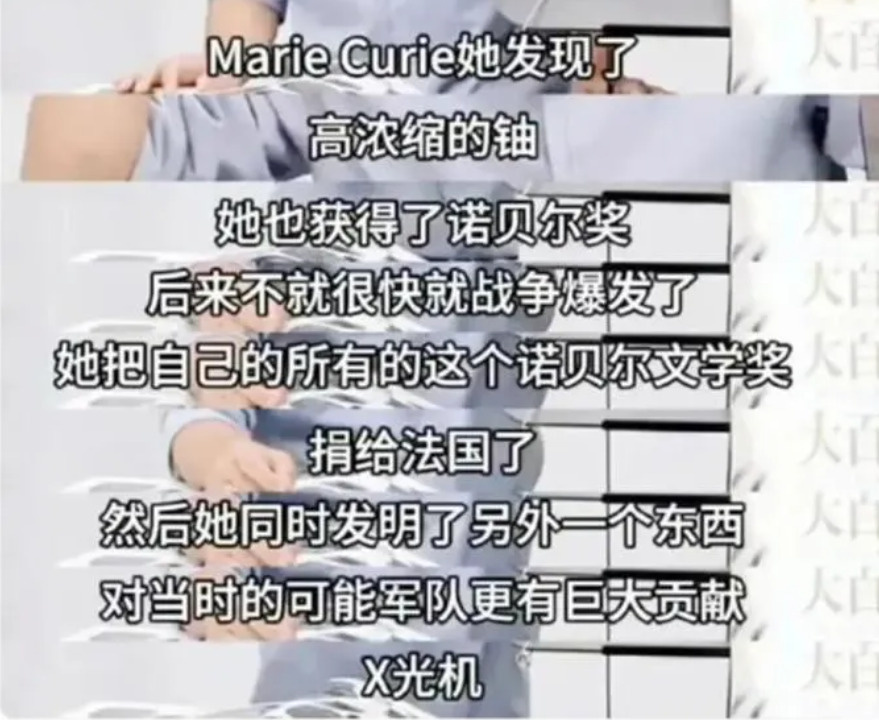 从将“羽扇纶巾”念成“羽扇lun巾”,到在直播中科普居里夫人时,短短三分钟内,因为发现了钋和镭,获得物理学奖和化学奖的居里夫人,变成发现了铀,喜提诺贝尔文学奖,还发明了X光机的居里夫人。