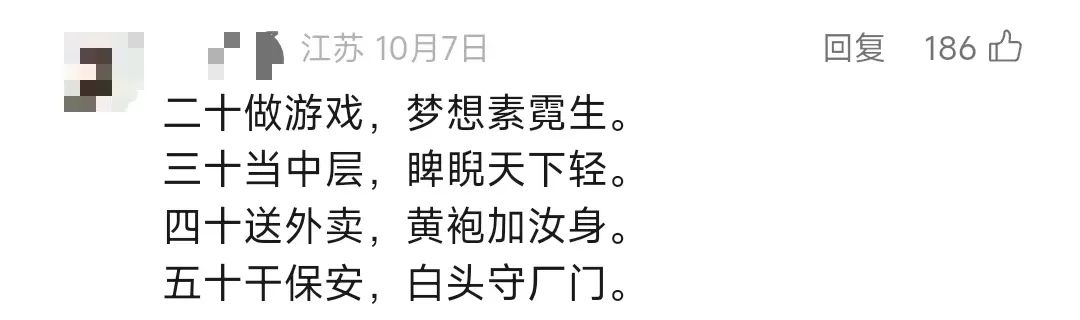 “之前和同事聚餐,我们也会聊「什么时候退休」还有「存多少钱能回家躺平」,有点得过且过、熬过一天是一天的感觉,没什么斗志了。我们现在年纪不算大,可能还没多少压迫感,但我有时会想,不往上爬的话,到35岁可能就被裁,那会儿离法定退休年龄还有好几十年,我攒下来的钱真够花吗?”