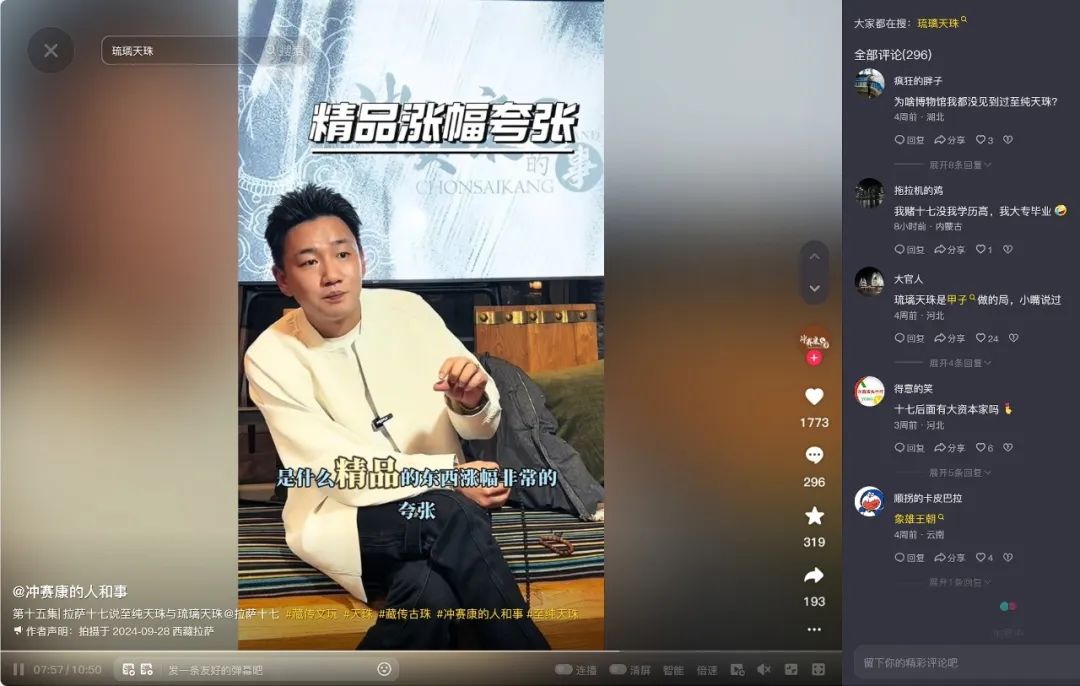 娱乐资本论了解到,有部分卖家称,“天珠”的价格在2013到2016年是低谷期,尤其是现代工艺的琉璃天珠需求不大,“那时蜜蜡更热门”。2013年几十块就能买到现在几百、几千的珠子。但是现在网红卖家确实推高了价格,这其中杨子当然是推销得最卖力,影响最大的一位。