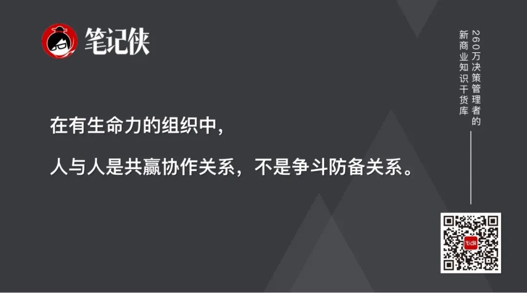 最后,在有生命力的组织中,人与人是共赢协作关系,不是争斗防备关系。