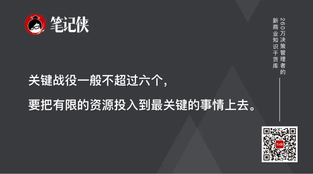 关键战役一般不超过六个,因为企业经营始终是资源有限的游戏,要把有限的资源投入到最关键的事情上去,这也是企业经营的智慧。