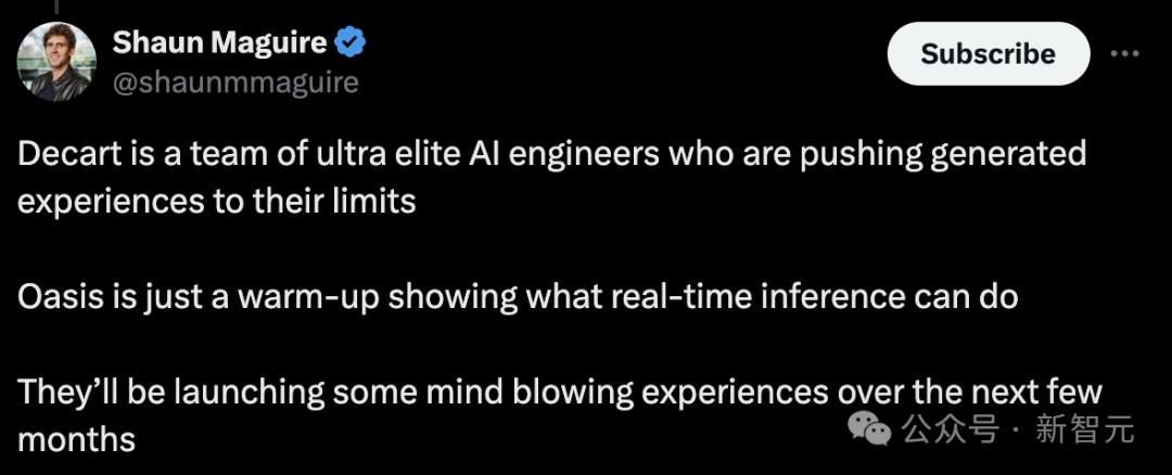 今天,红杉资本更是豪掷2100万美金对其进行了投资,合伙人Shaun Maguire更是大力称赞Decart的团队,认为他们是「超精英的AI工程师」、「合作过的技术最有天赋的团队之一」,正在将生成式体验推向极致。