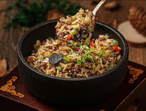 另外,这批素食餐厅还会十分注重菜品的融合创新,融合西餐、江浙菜、川菜等多种菜系特点,提供多样口味。比如庆春朴门的黑松露炒饭,就选用了意大利进口的橄榄油和黑松露酱,在此基础上增加黑米、糙米,中、西融合,口味更丰富。