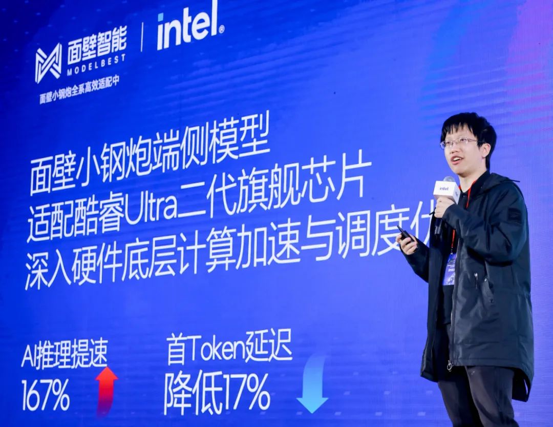 端侧模型和底层算力芯片,模型层和算力层的打通意义在于,终端推理的性能优化至关重要,经过优化的推理性能,以及芯片微架构的改进,可以较未经优化的原始性能提升数十倍。一个案例是,面壁MiniCPM在今年9月份这次和英特尔芯片的适配,相比2月份的“首次”,仅隔半年,提速169%。