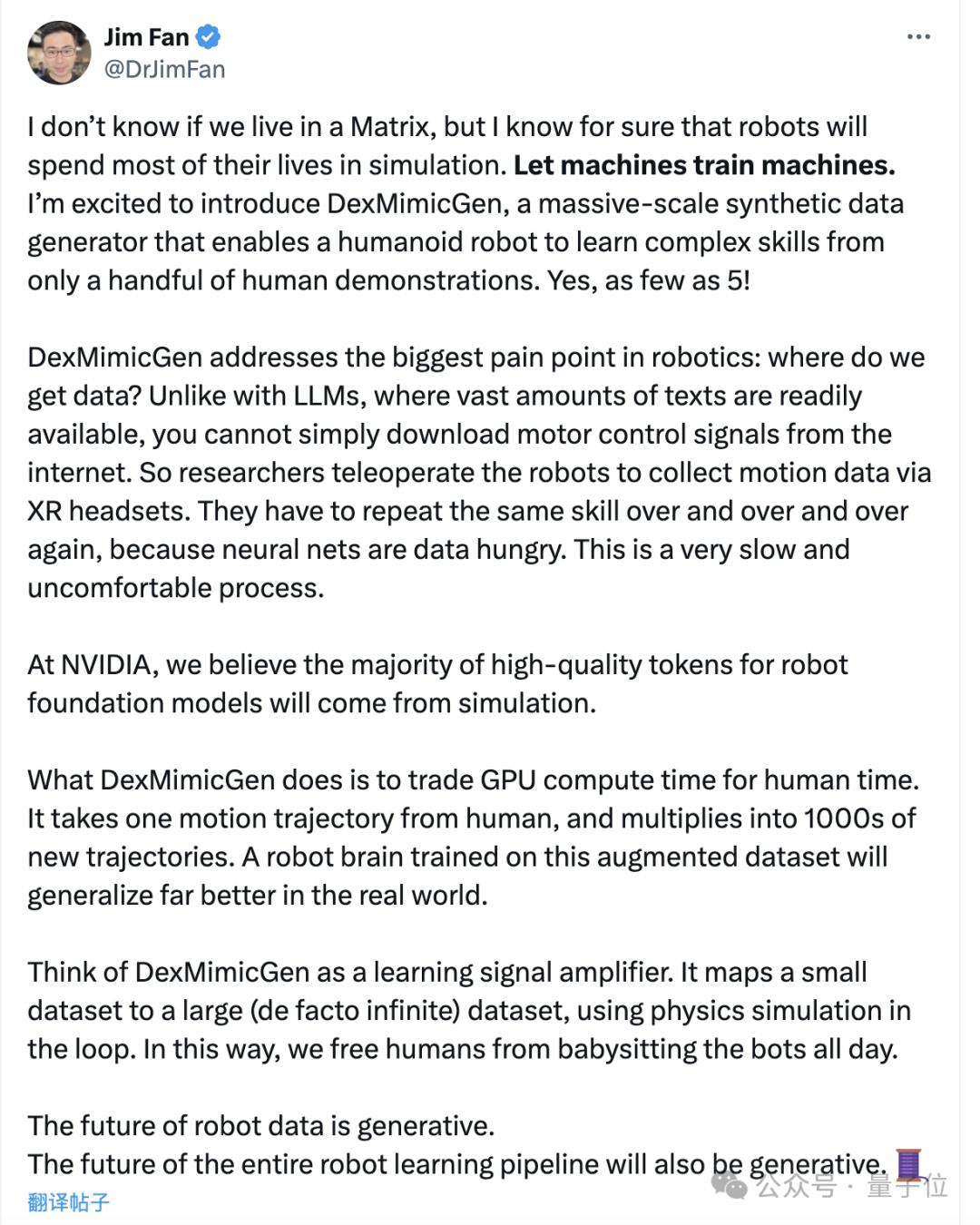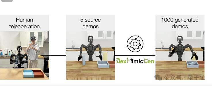 英伟达实验室,提出了机器人训练数据缺乏问题的新解决方案——DexMimicGen。