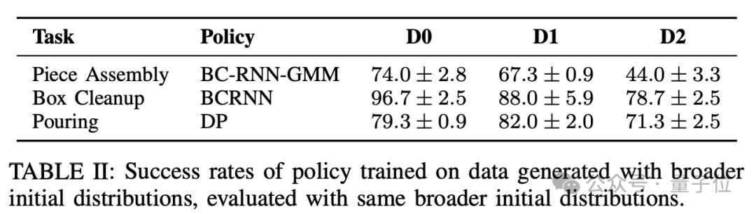 针对初始状态分布变化,DexMimicGen也体现出了较强的鲁棒性,在更广泛的初始状态分布D1和D2上测试时,仍然能够拥有一定的成功率。