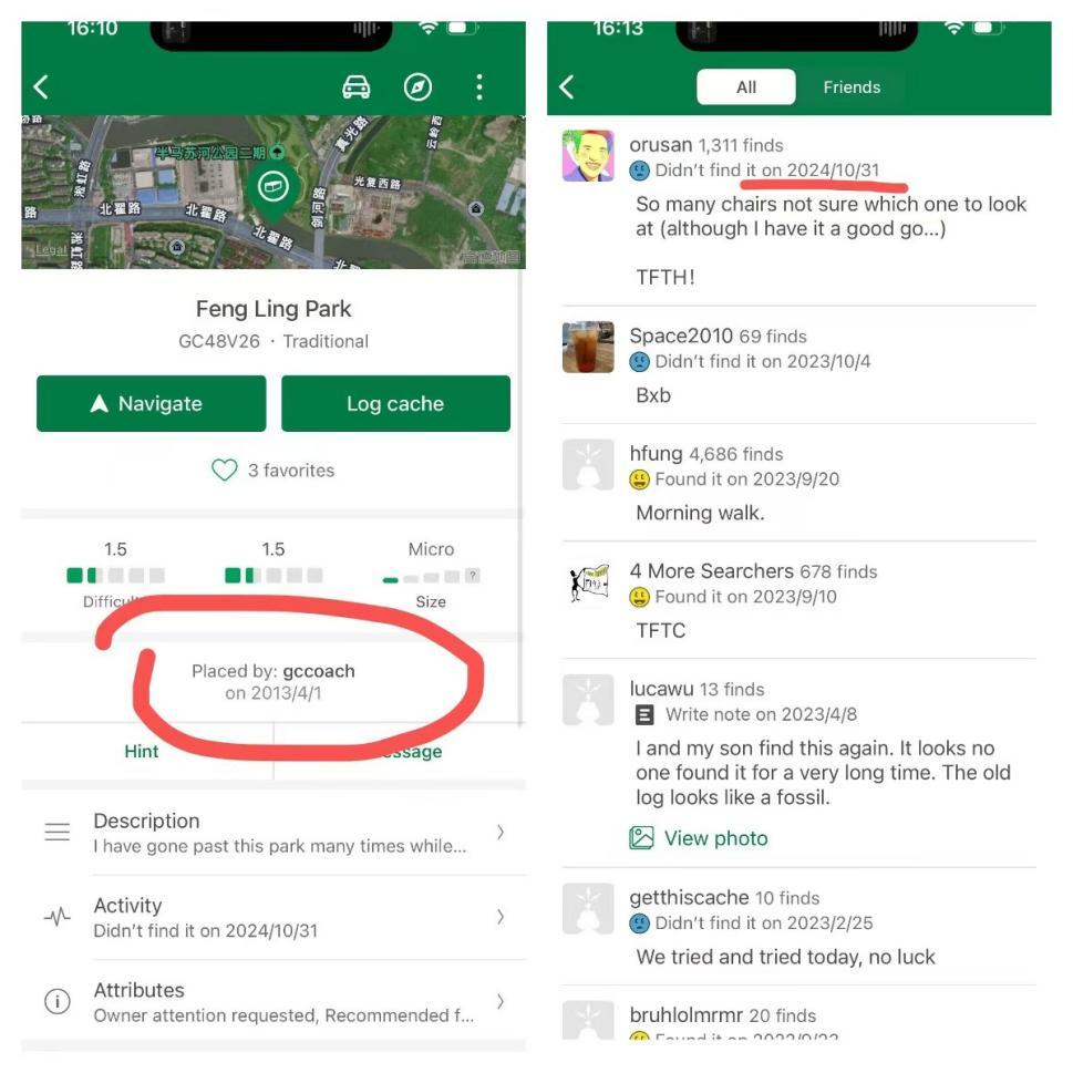 以上海为例,我随便点开了几个藏宝点,藏宝时间大多为2021年到2023年期间。我还发现了一个创建于2013年的藏宝点,距今天已经过去了10年,但在评论区里,我惊喜地发现,在2024年10月份还有人去寻找过这个藏宝点。