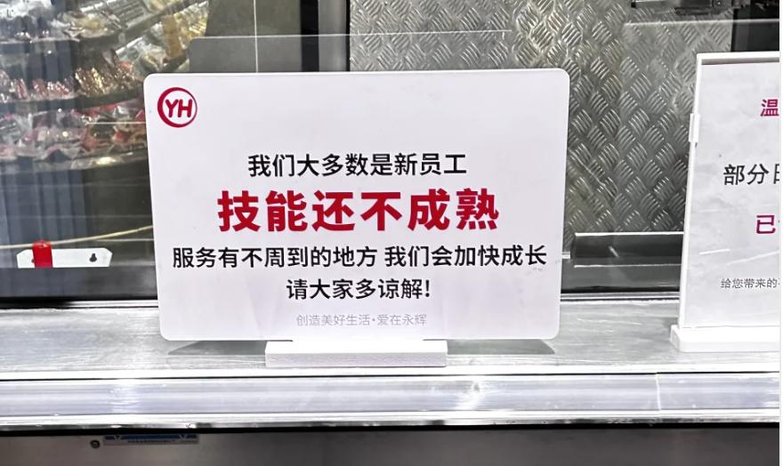 而在超市各个角落,都能看到红字白底的提示牌,学着“我们大多数是新员工,技能还不成熟,服务有不周到的地方,我们会加快成长。”等提示,看起来诚意满满。