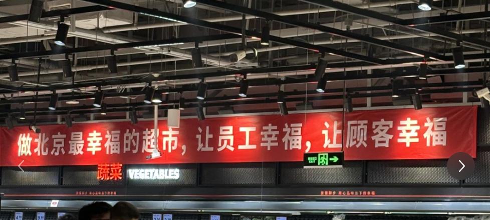 走进永辉超市第一感知是氛围感很浓,比如超市门口写着的“做北京最幸福的超市”标语看起来都“胖里胖气”。店内更是拉出了横幅,号称要走“北京最幸福的超市,让员工幸福让顾客幸福”。