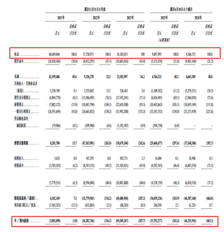 反映在财务层面,2021年、2022年及2023年,觅瑞集团分别实现营收6064.98万美元、1775.90万美元、2418.50万美元,对应地,觅瑞集团在2022年及2023年的年度亏损分别为308.1万、5620.27万美元、6956.93万美元。
