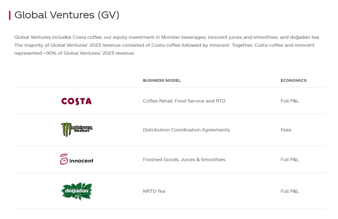 按照不同品牌来看,这一全球风投部门2023年的大部分收入来自Costa咖啡,其次是innocent。两者合计占该部门2023年收入的约90%。