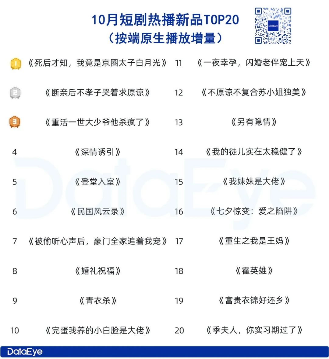 10月DataEye端原生热播新品榜中,剧场号木兰短剧播出的《死后才知,我竟是京圈太子白月光》登顶,播放增量超2.5亿。麦芽热血剧场的《断亲后不孝子哭着求原谅》第二,龙帅剧坊的《重活一世大少爷他杀疯了》第三。