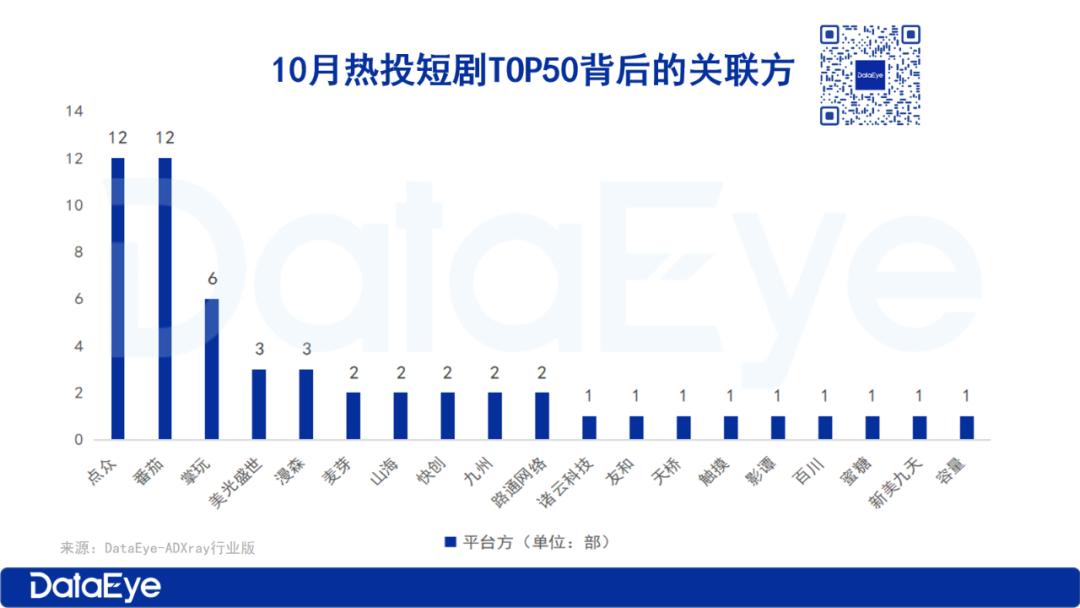 从关联方来看,点众、番茄、掌玩、美光盛世、漫森等公司表现较为活跃,10月DataEye短剧热力榜TOP50中,点众和番茄各占12席,掌玩占6席,美光盛世和漫森各占3席,麦芽、山海、快创、九州和路通网络均占2席。