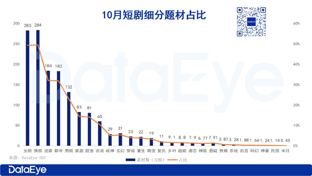 三、10月短剧热投题材:女频题材优势明显,女频热度再下降