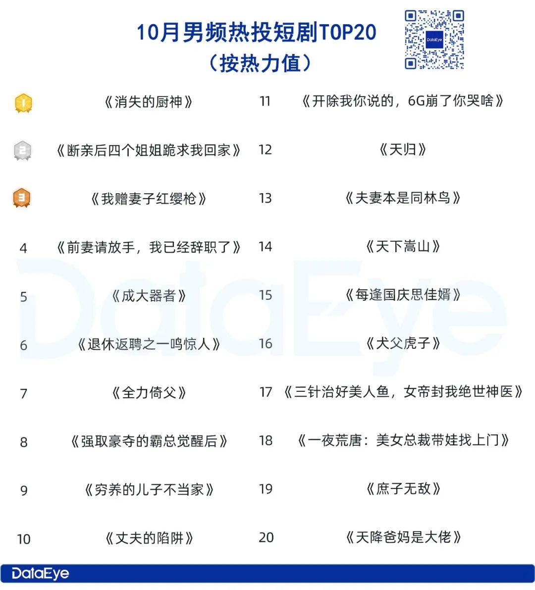 2、10月男频/女频热投短剧TOP20:女频强势霸榜,男频新题材涌现