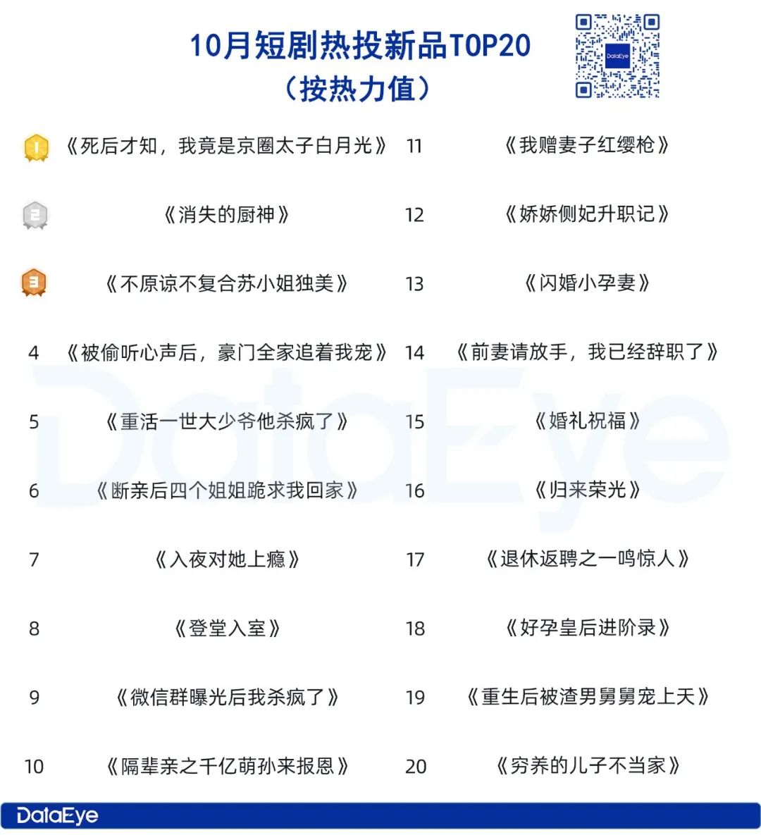 10月DataEye短剧新品榜(按热力值)中,番茄和点众的《死后才知,我竟是京圈太子白月光》登顶,麦芽《消失的厨神》第二,掌玩《不原谅不复合苏小姐独美》位列第三。