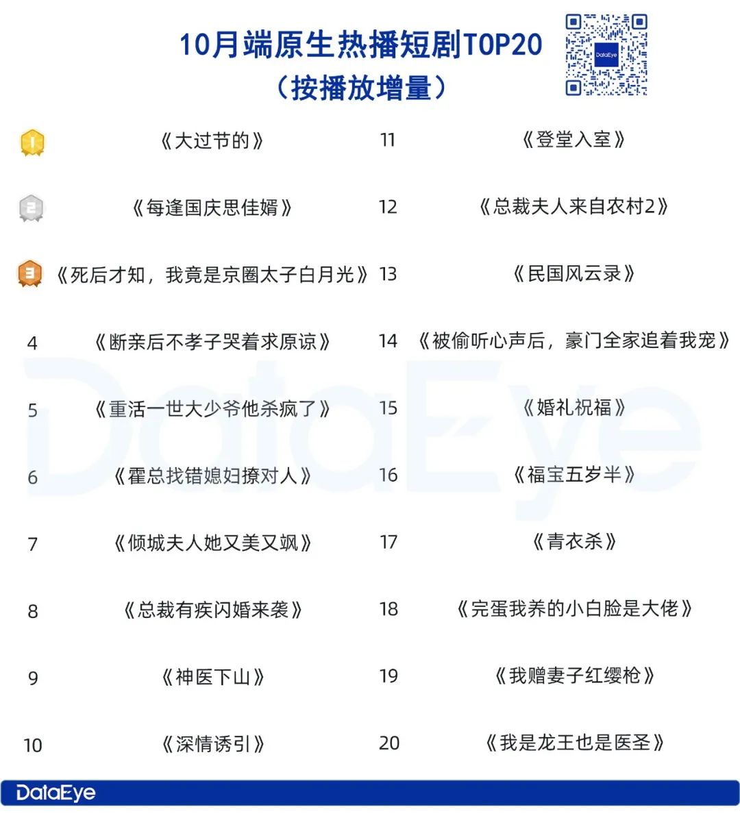 10月DataEye端原生热播榜中,剧场号她的世界播出的《大过节的》登顶,阳光微剧播出的《每逢国庆思佳婿》第二,木兰短剧《死后才知,我竟是京圈太子白月光》位列第三。