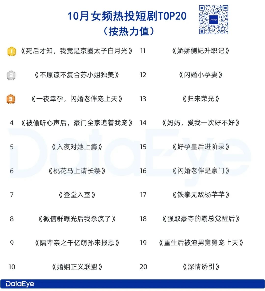 二、10月短剧新品榜TOP20:女频表现强势,TOP3热度领先
