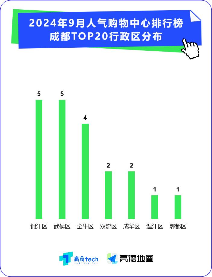 9月成都人气购物中心TOP20 分布在7个行政区 ,锦江区、武侯区、金牛区上榜项目数量就有14个,均为成都传统老城区,坐拥密集消费人口。