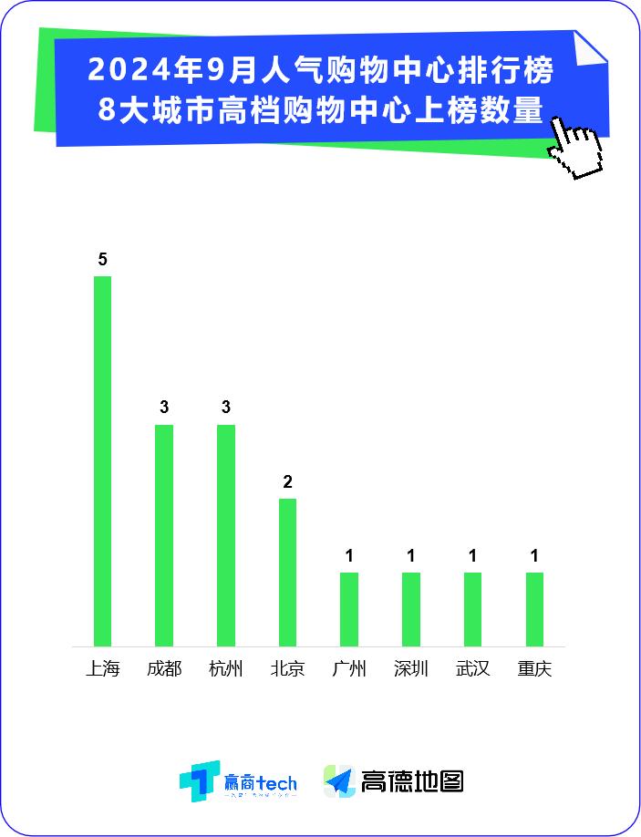 近日,在赢商tech与高德地图联合的 《9月人气购物中心排行榜》 上 ,8城120个上榜购物中心仅有24个人气指数超过7.00,这其中成都就占了5个。 最高人气指数的TOP10中,成都更是独占3席 ,风头无两。