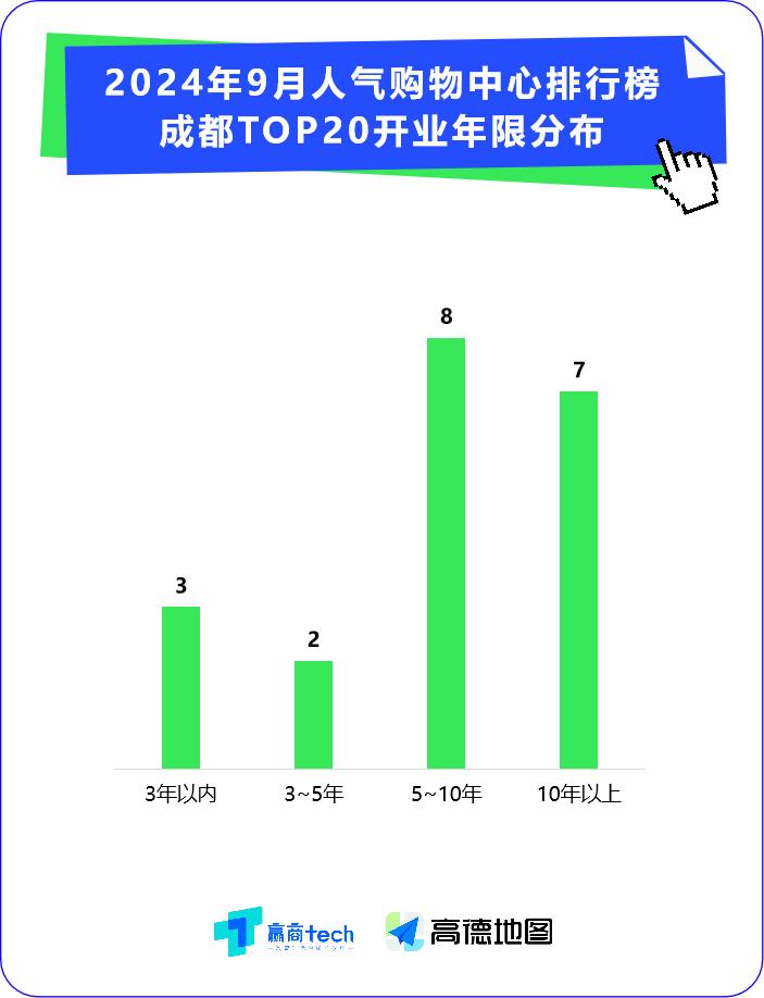 成都TOP20亦遵循这一规律,开业5年以上项目为主流, 近3年新开业购物中心只有3家 ,分别 成都光环购物公园、成都天府和悦广场、龙湖成都蜀新天街 ,人气指数分别排行成都12、19、20位。