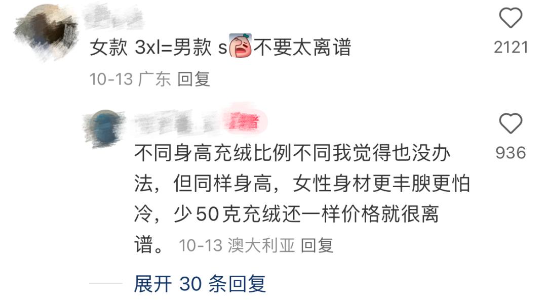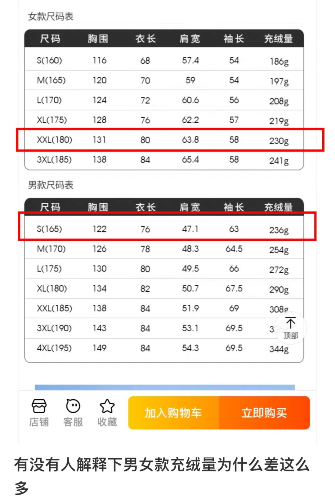 女款最大码3XL比男款最小XS码充绒量少5克,更别提同码之差,女款最小码比男款最小码少了11克,“要知道女款最小码也才26克,相当于少了半件衣服。根据售价299元来算,每买一件女装相当于比男装亏126.5元。”