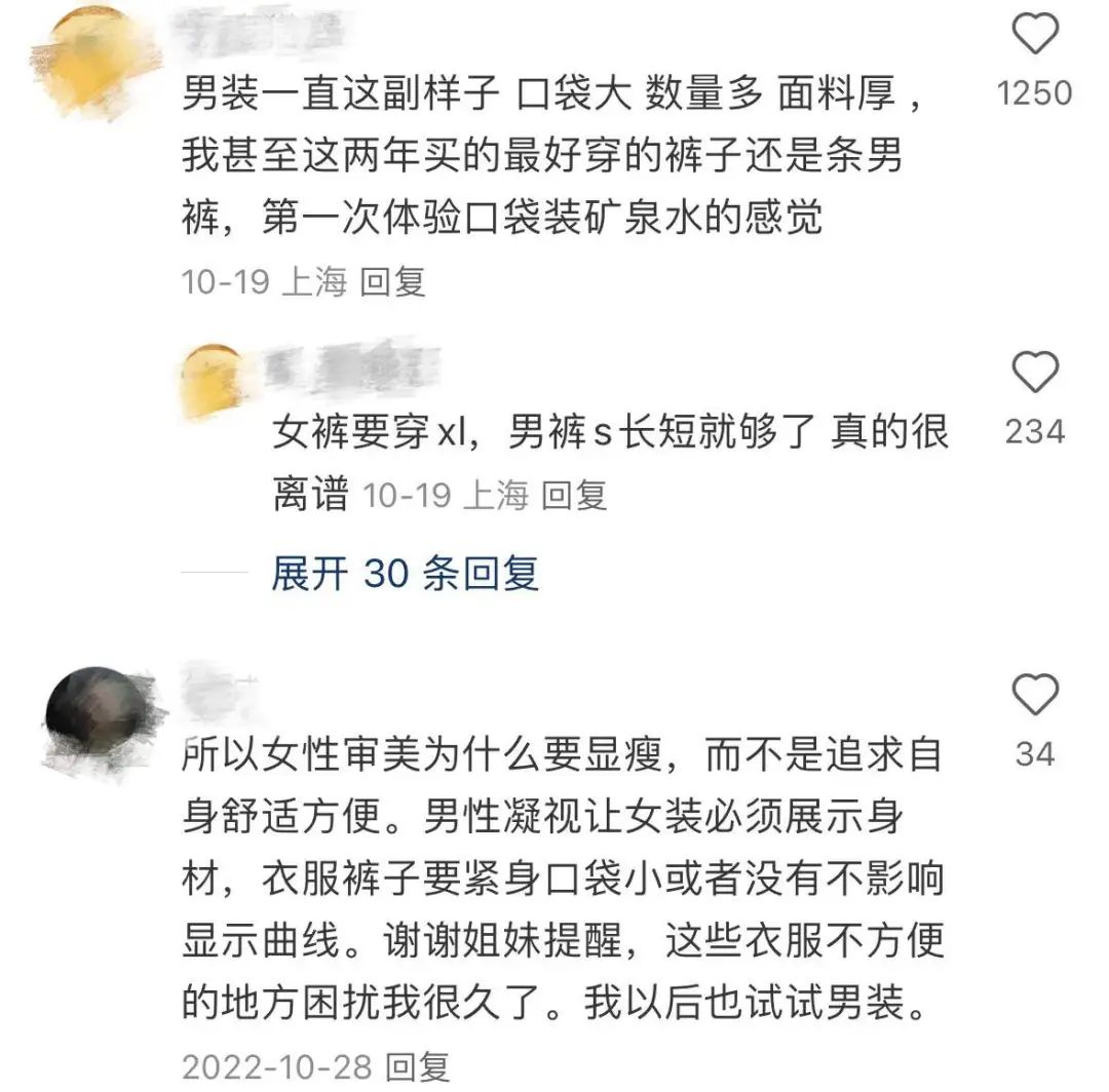 商家早就摸透了【女性的爱好】,为了美丽能承受更多的“苦难”,同时作为拥有更高消费能力的群体,商家在衣服设计时也会贴心。比如男装口袋一向以能装矿泉水出名,反之女装口袋更小更少,有人猜测老板是为了省2块布料,殊不知这是为女性留下更多买包的空间。