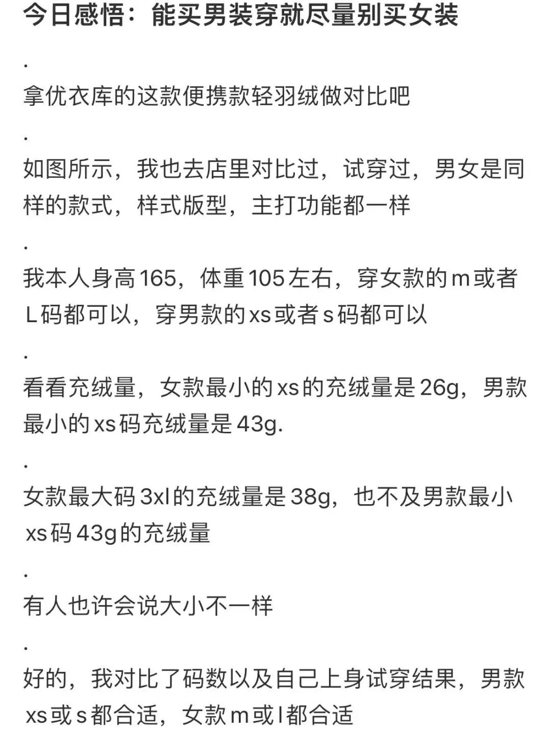 还有网友早在2年前就指出买羽绒服的真理“尽量买男装”。彼时优衣库的冬季火爆单品便携款轻羽绒也出现了【更轻的女款羽绒服】: