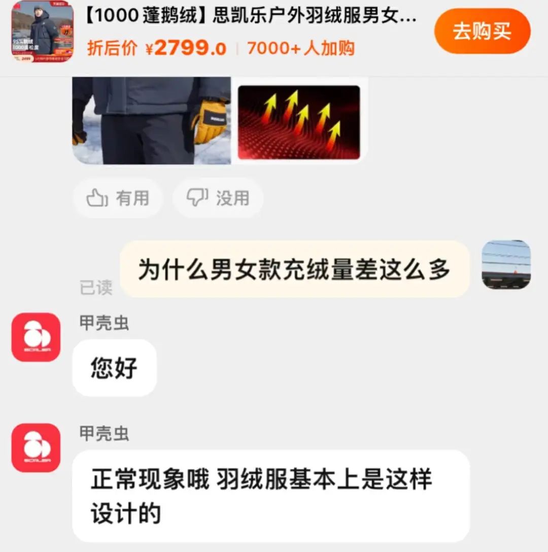 “正常现象哦,羽绒服都是这样设计的。”思凯乐客服回应道。