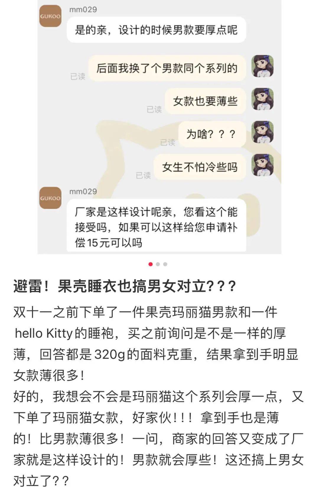 就在几天前,网友买睡衣时发现,果壳一件男女同款的睡衣原本标注“都是320g的面料克重”,实际到手发现女款更轻后追问商家才得知“厂家就是这样设计的,男款就会厚些”。