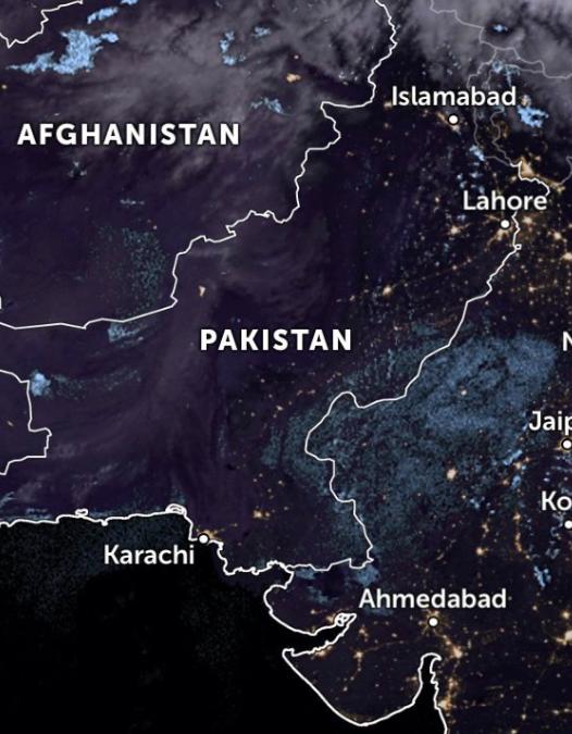 卫星图像揭示了2023年大停电对巴基斯坦的影响:信德省、开伯尔-普什图省、俾路支省和旁遮普省大部分地区一片漆黑,仅伊斯兰堡和拉合尔部分地区有少许亮光