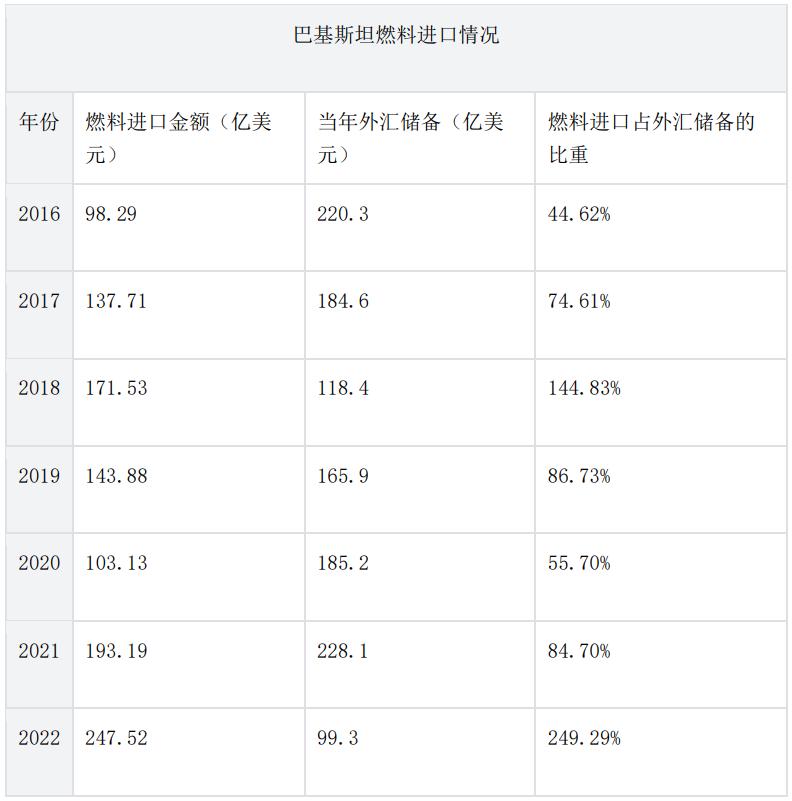自 2016 年以来,巴基斯坦平均每年花费约 142.18 亿美元从海外进口石油、天然气等燃料。有些年份,能源进口的花费甚至超过了国家外汇储备的总额。近几年,俄乌冲突导致国际能源价格剧烈波动,进口能源的成本随之飙升。这不仅让巴基斯坦的外汇储备捉襟见肘,也使得国内生产成本持续上涨。