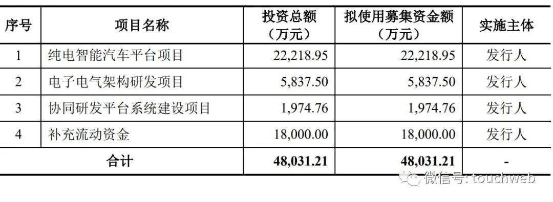 龙创设计原计划募资4.8亿元,其中,2.22亿元用于纯电智能汽车平台项目,5837.5万元用于电子电气架构研发项目,1974.76万元用于协同研发平台系统建设项目,1.8亿元用于补充流动资金。