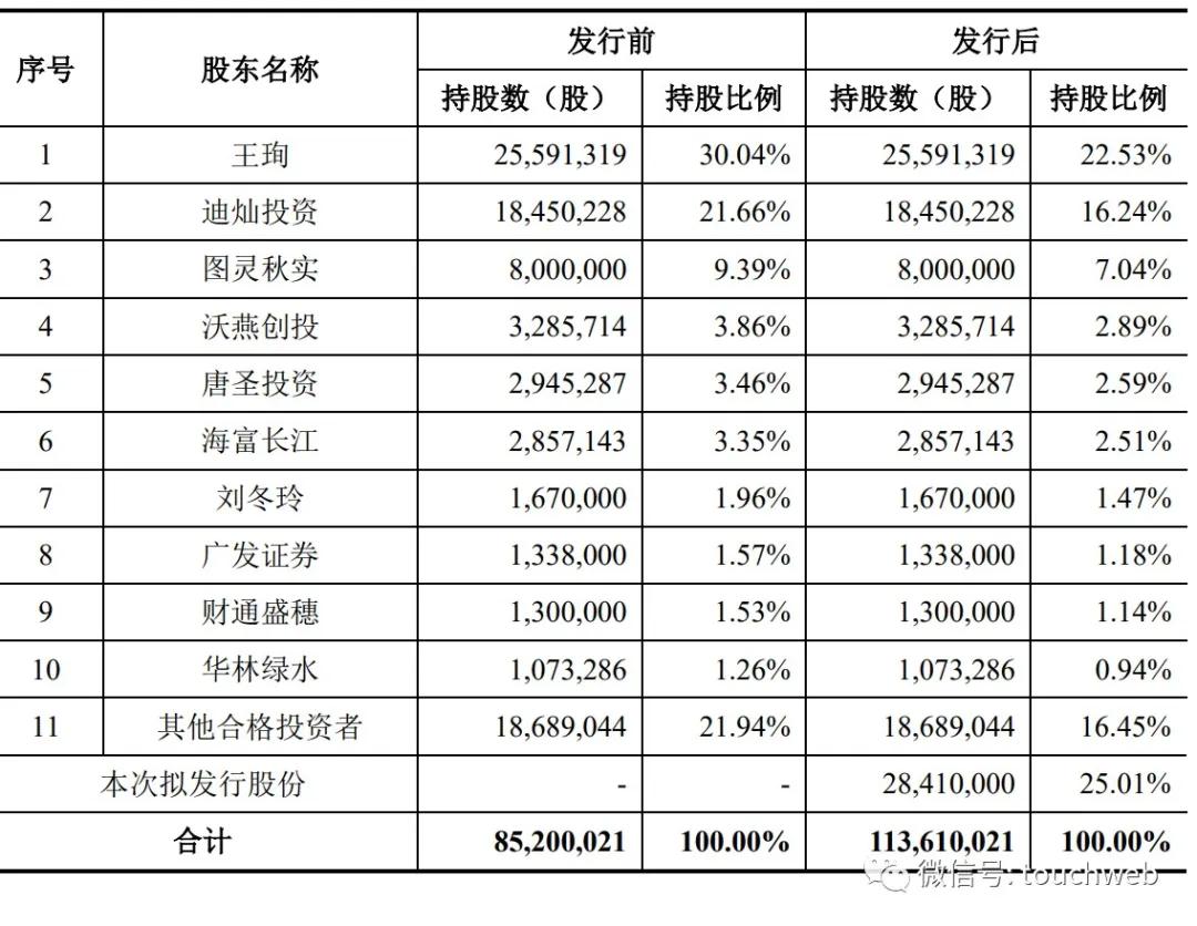 IPO前,图灵秋实持股为9.39%,沃燕创投持股为3.86%,唐圣投资持股为3.46%,海富长江持股为3.35%,刘冬玲持股为1.96%,广发证券持股为1.57%,财通盛穗持股为1.53%,华林绿水持股为1.26%。
